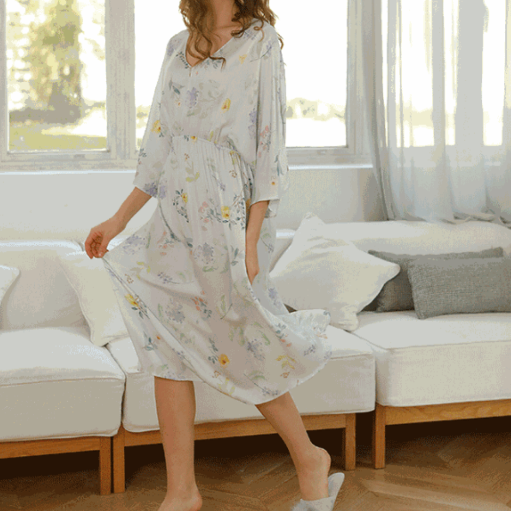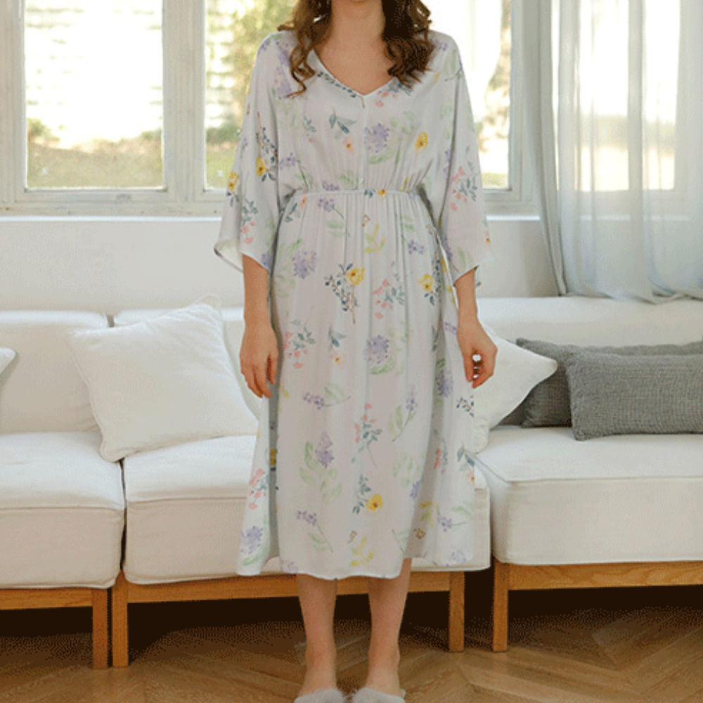 Our Alexa is one of our comfiest lounge dress with soft floral print and garterized waistline.