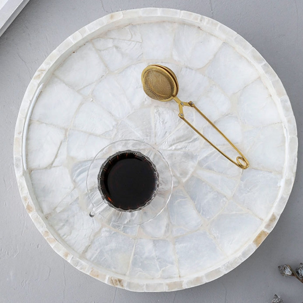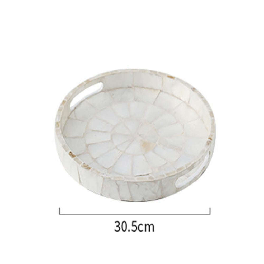 This modern elegant serving tray is made by hand with real shells and wood. It has handles for easy carrying. A beautiful piece to sit atop your bed, ottoman, couch, or even as a centerpiece for your table.