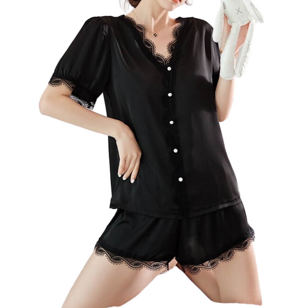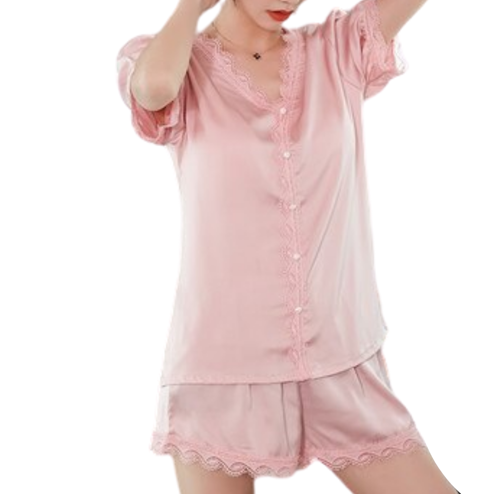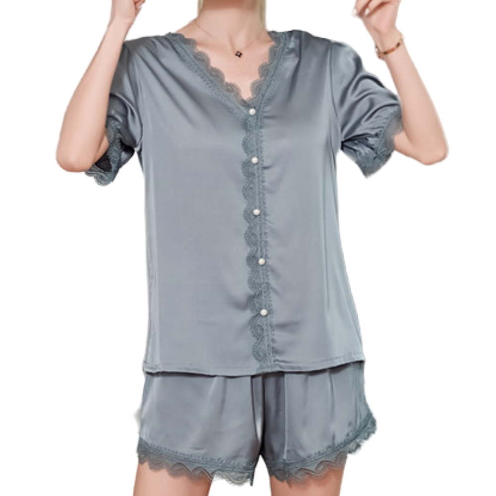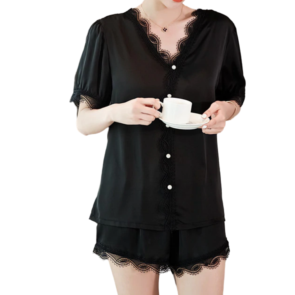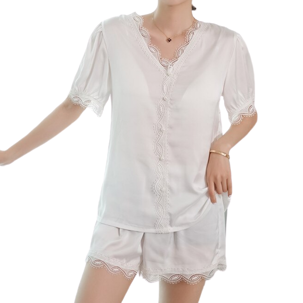 The Audrey pajama set is equally glamorous and comfortable. Cut on t silk that slips over your body, with lace detail on hems, while the elasticated shorts have a flared hem for a comfortable fit when you're sitting and sleeping. Layer the top under a jacket when you go out to do a business telecon or wear the shorts with heels and a loose jacket for a date night.