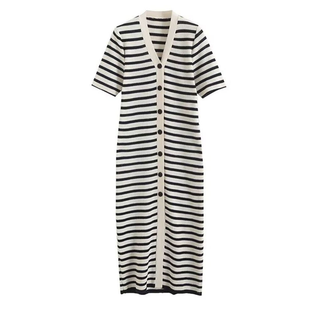 Basterbine is a Striped-single-breasted Breasted Knitted Midi Dress with a Vintage V-neck and Short Sleeves.