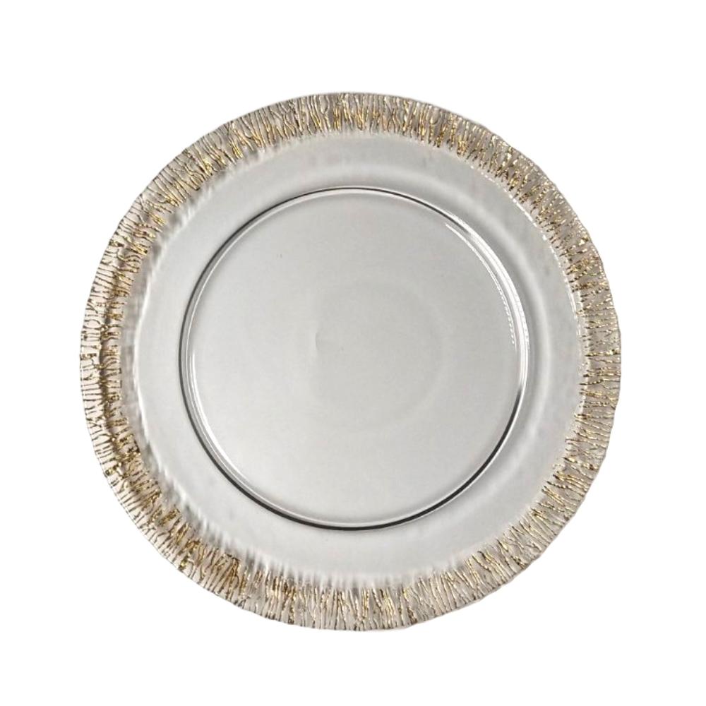 Dine with elegance with Belfast chargers! Clear glass charger plate with unique gold outline design.