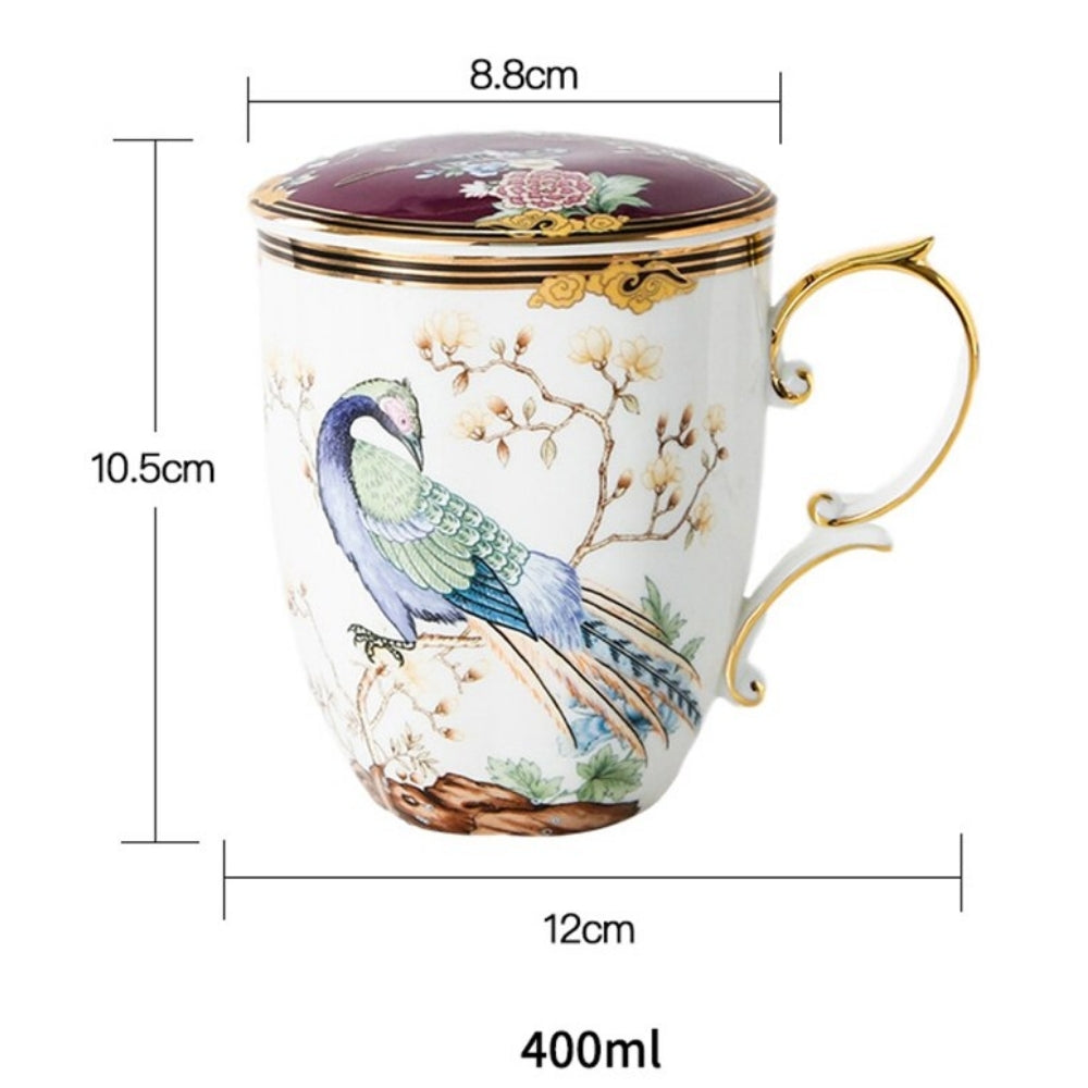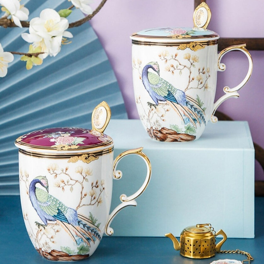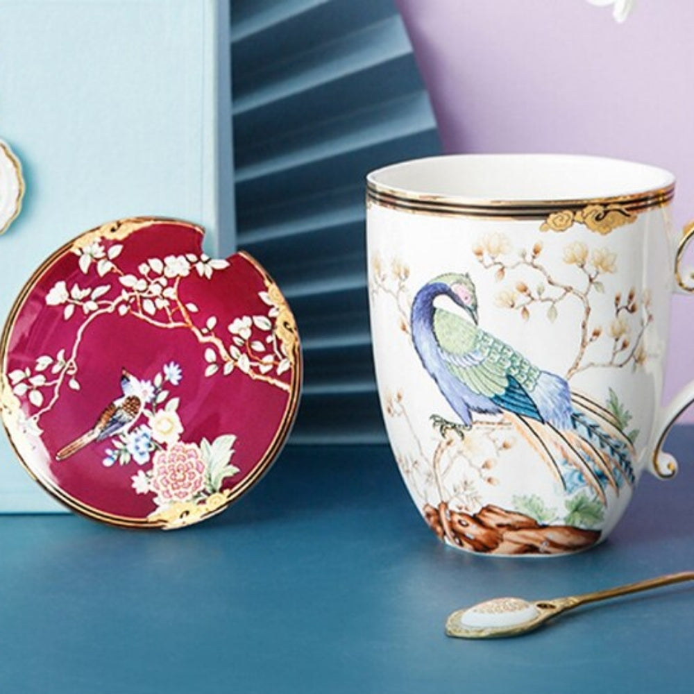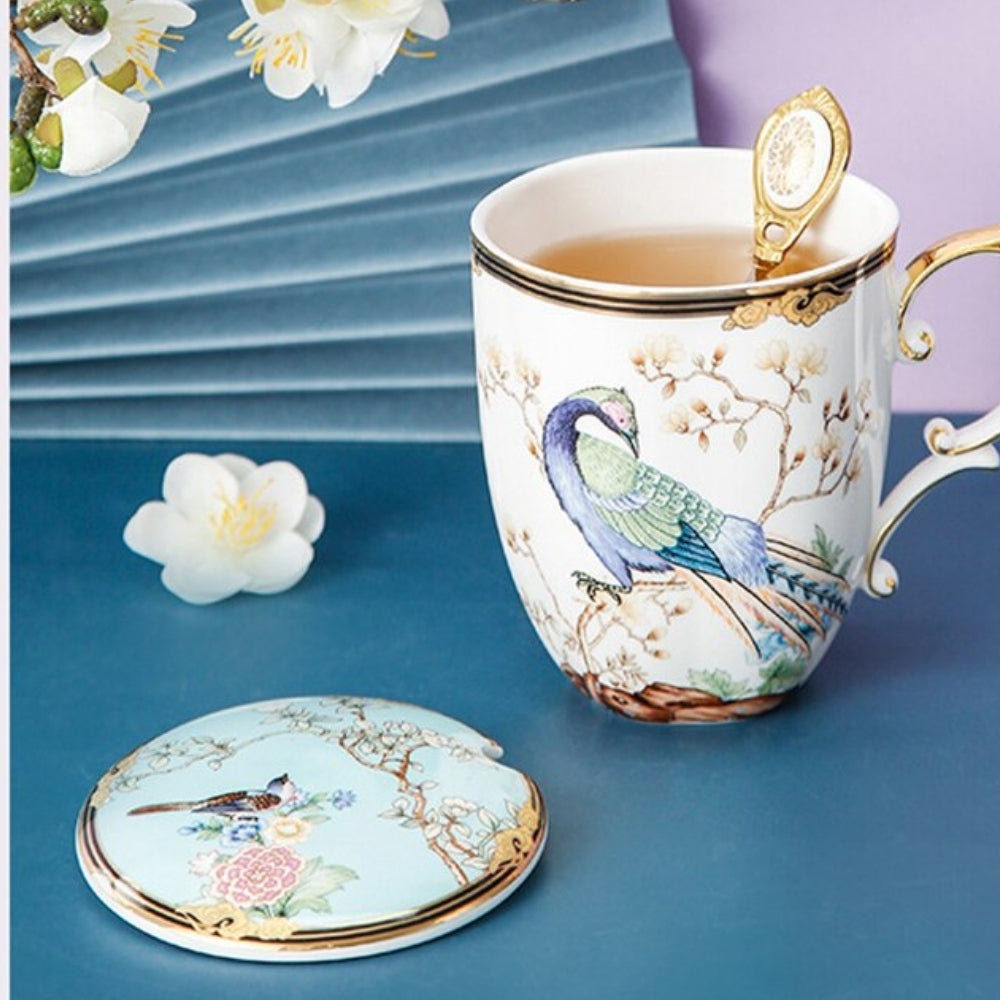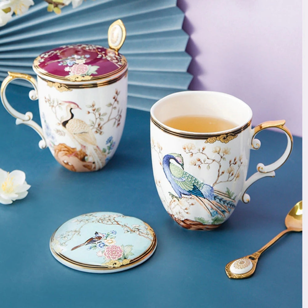 Pretty tea cups with cover and teaspoon.