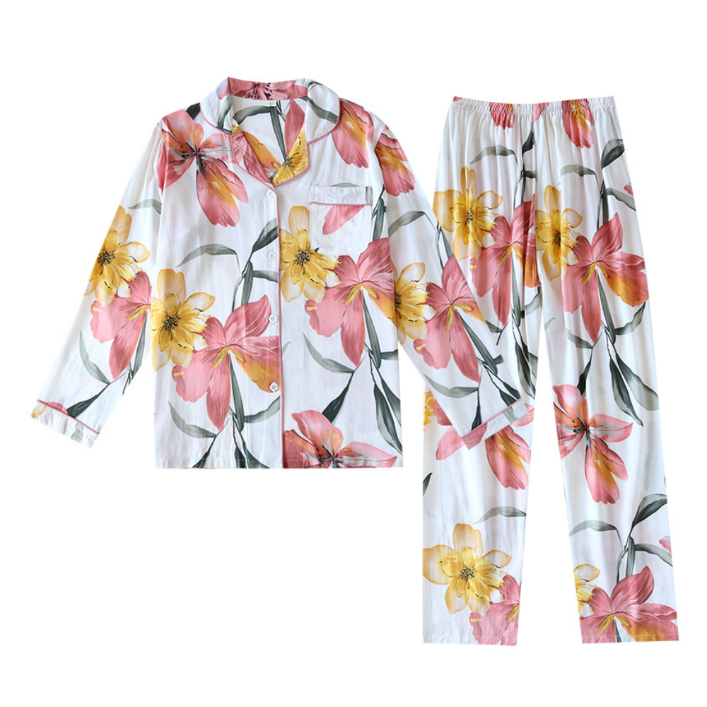 Classic viscose fabric pajama set featuring classic lapels, contrast cuffs, and a relaxed fit.