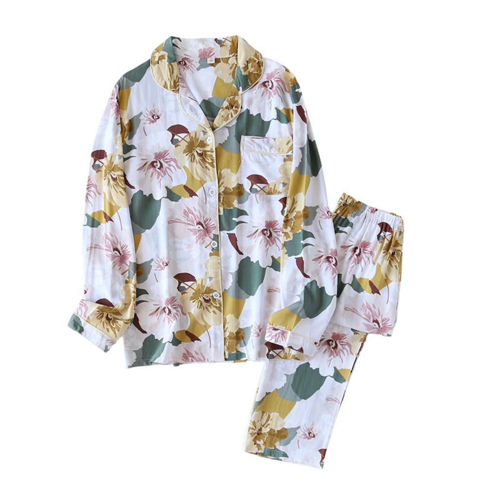 Classic viscose fabric pajama set featuring classic lapels, contrast cuffs, and a relaxed fit.