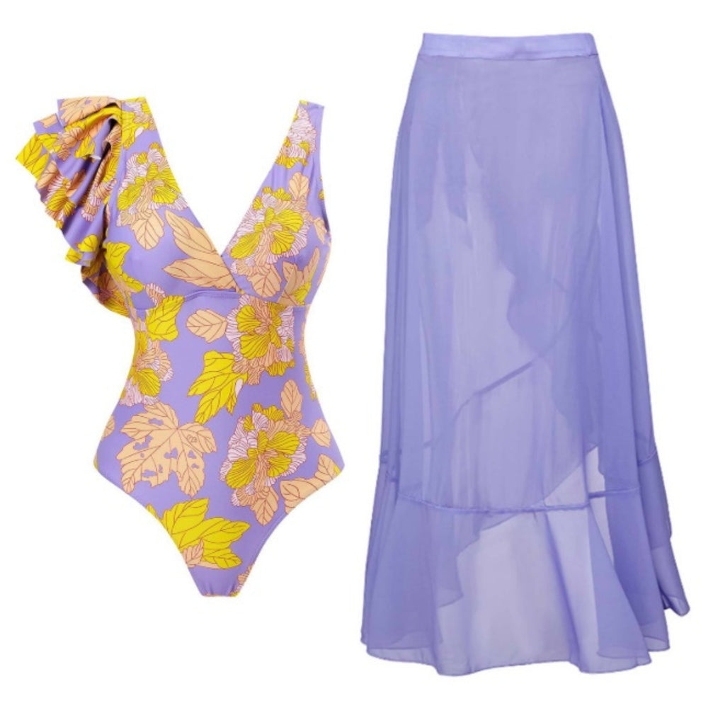 Gorgeous one piece swimsuit. Tropical Floral Print Low cut v-neck in the front and back with a ruffle design in one side sleeve.