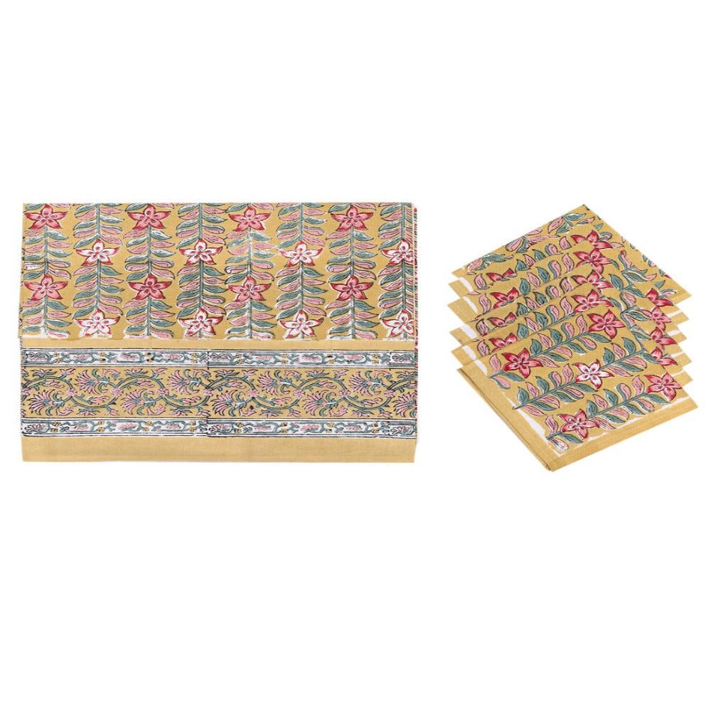 Brighten up your table setting for any occasion with our authentic hand printed Tablecloth Set from India! This lightweight cotton tablecloth is easy to throw over any dining table and is adorned with playful block print to bring a soft texture and whimsical touch to rest of your tableware.