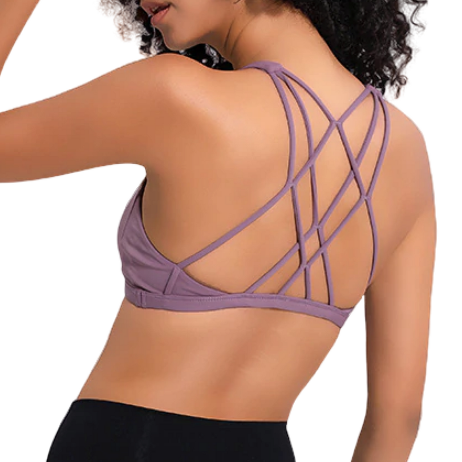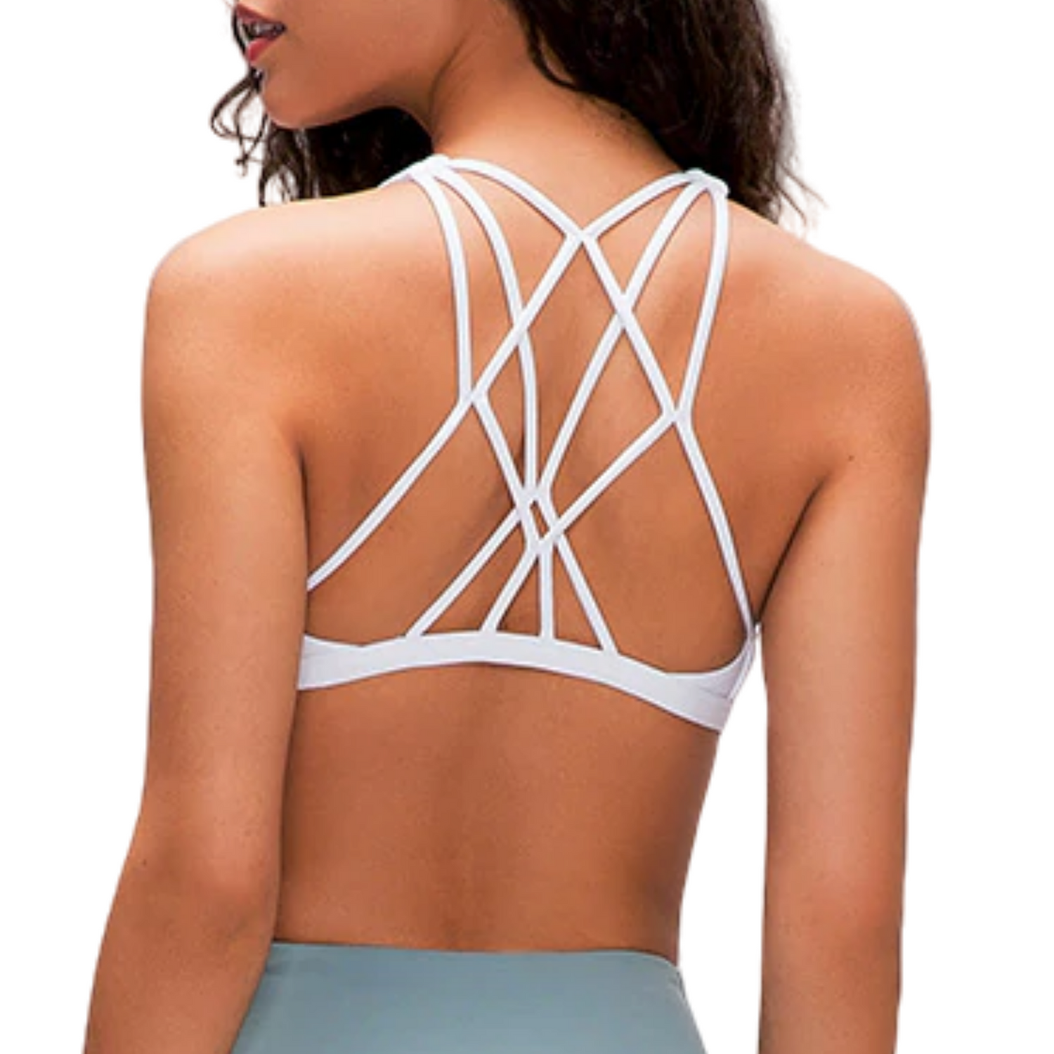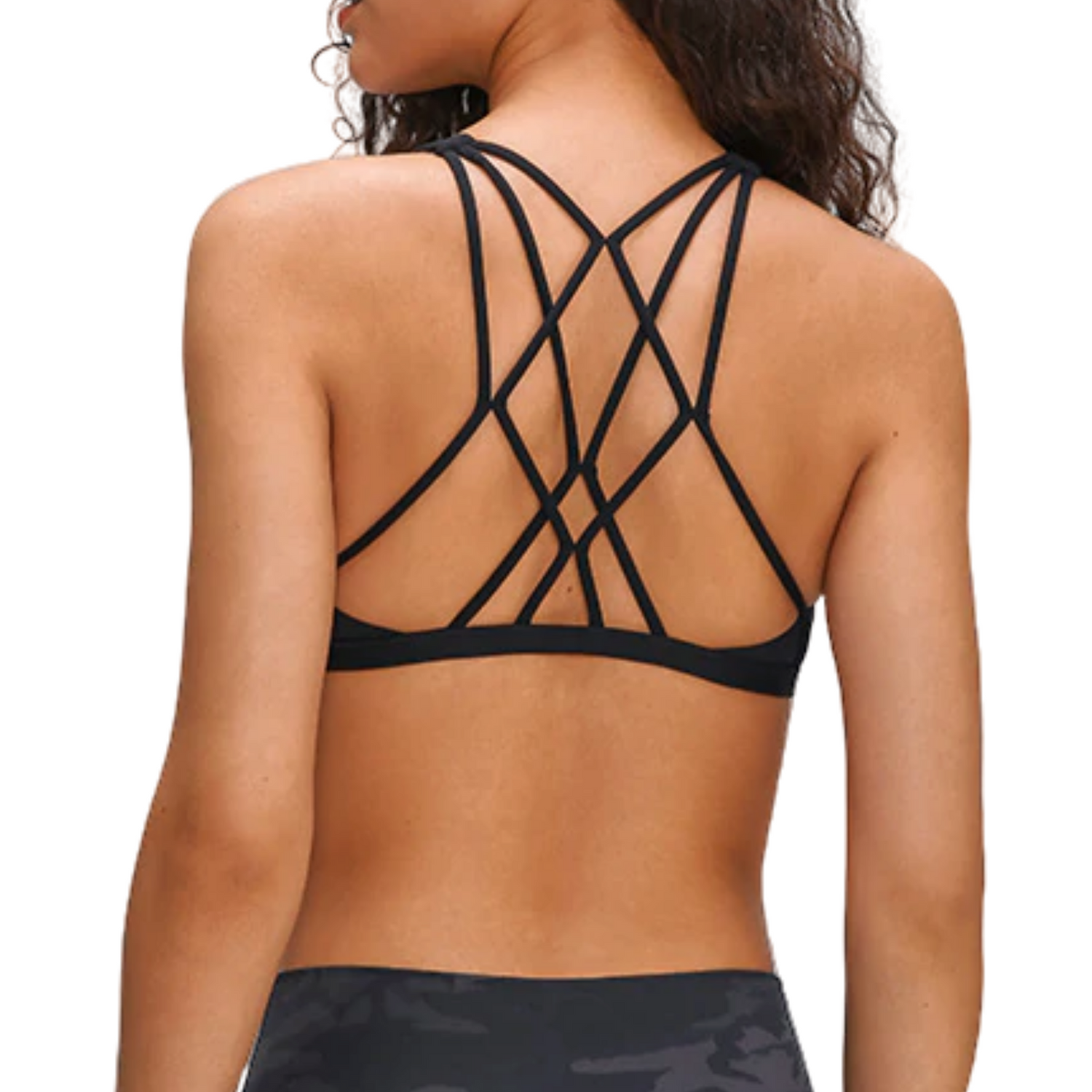 The Johanna can beat the heat of the steamiest yoga class made from breathable fabric with light support. The multitude of straps radiating down the back are sure to shine under drapey layers.