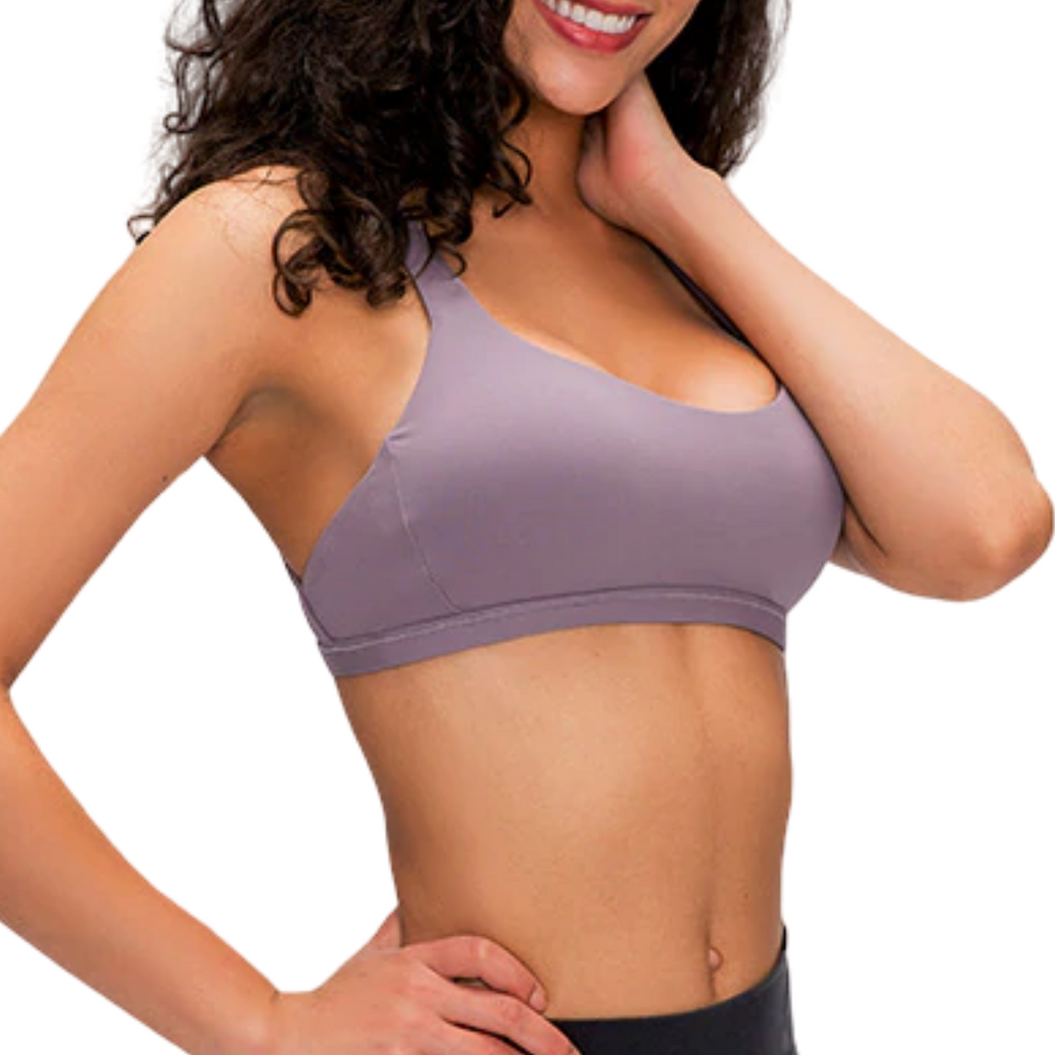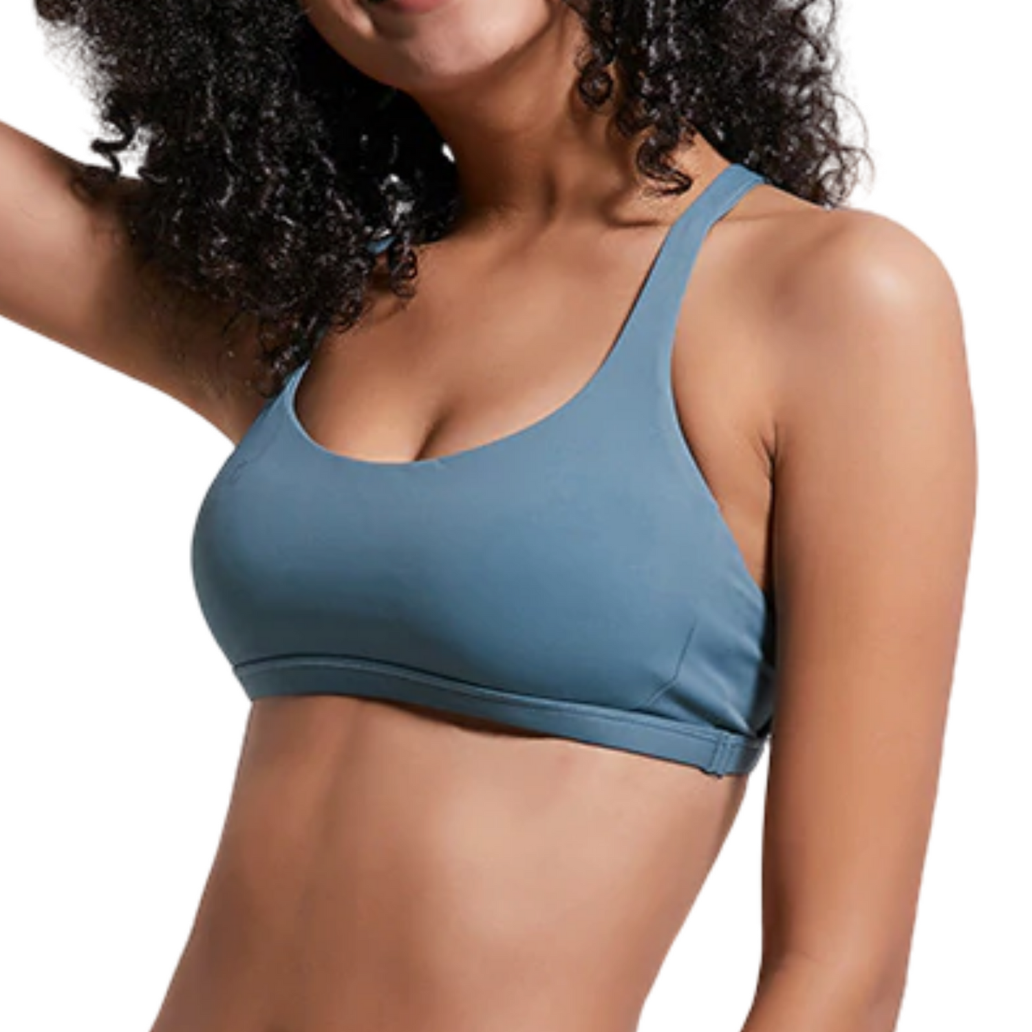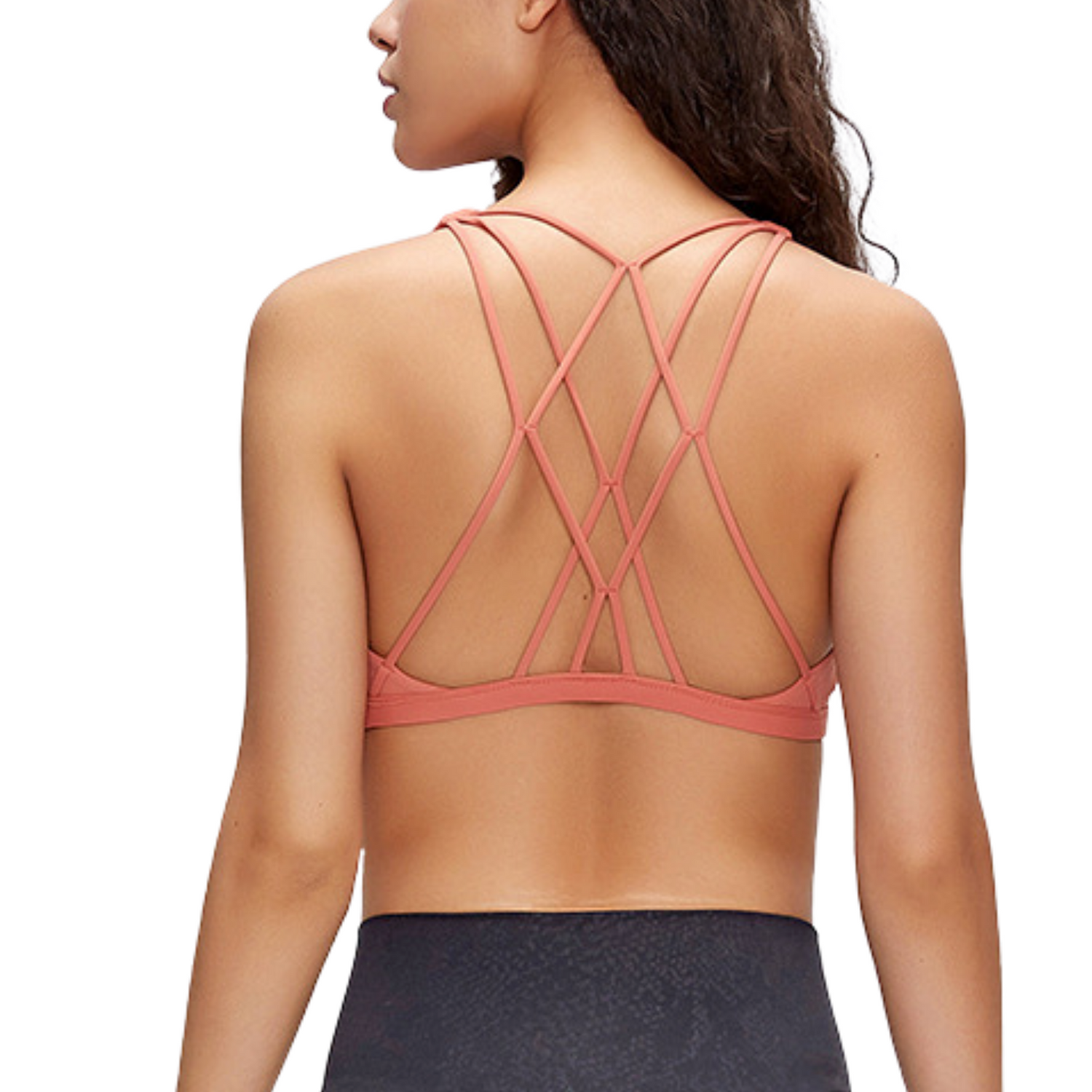 The Johanna can beat the heat of the steamiest yoga class made from breathable fabric with light support. The multitude of straps radiating down the back are sure to shine under drapey layers.