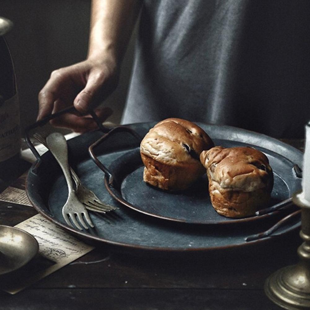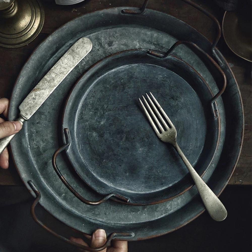 Laugar, our round vintage metal plate,tray. Can be used for serving food or as a dressing table tray.