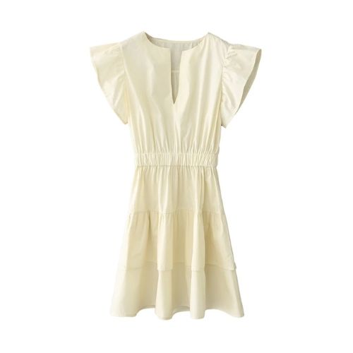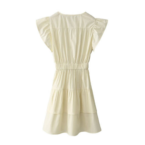 Mazy dress in V-neckline in ruffle short sleeve and garterized waistline.