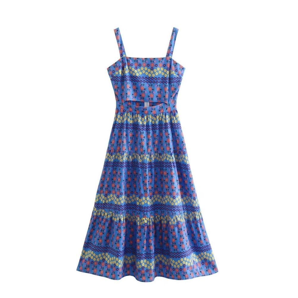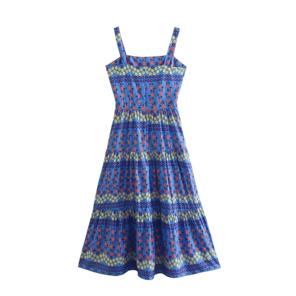 Okinawa is a midi dress with a printed design, square collar and sleeveless. Perfect for work and casual outfits. Polyester fabric.