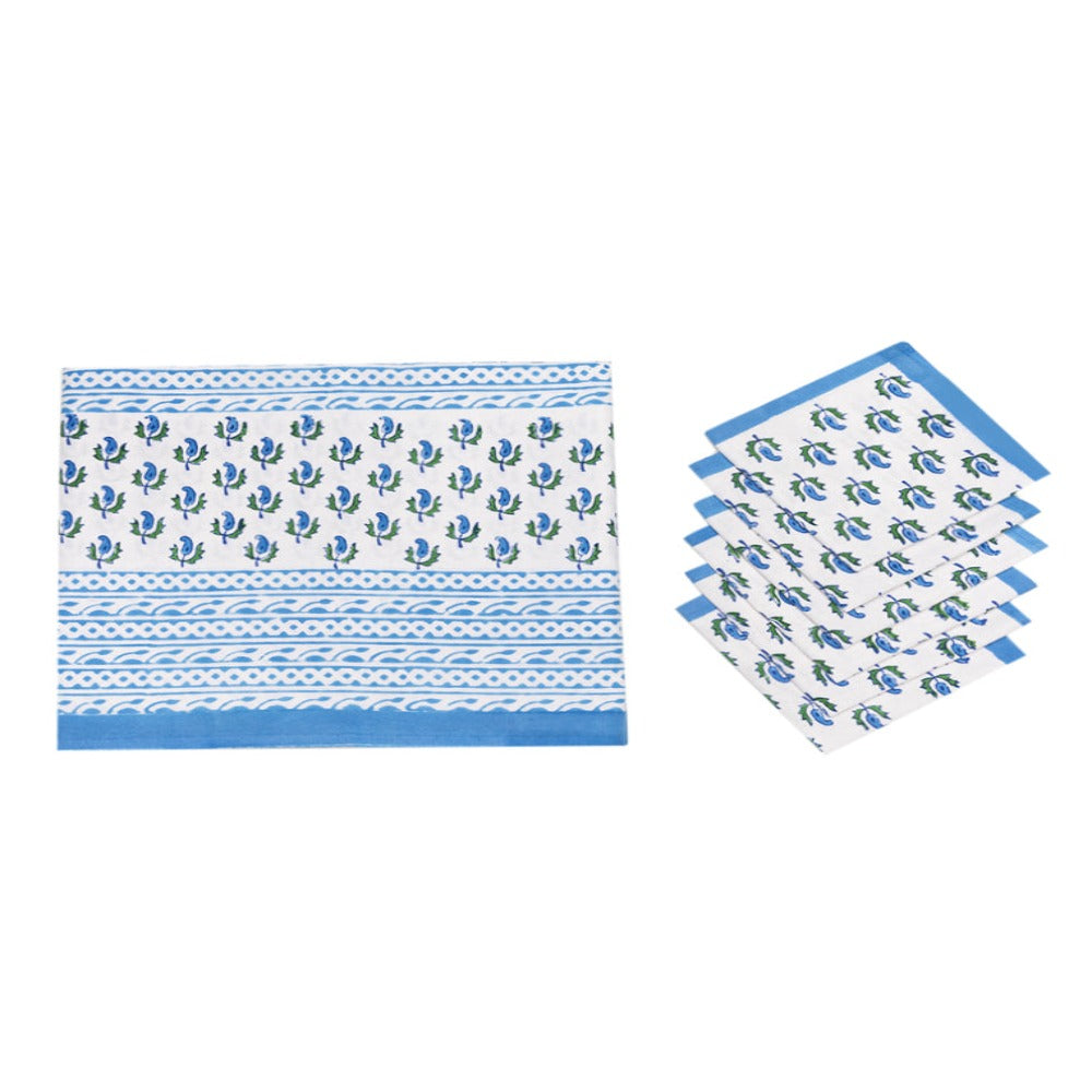 Brighten up your table setting for any occasion with our authentic hand printed Tablecloth Set from India! This lightweight cotton tablecloth is easy to throw over any dining table and is adorned with playful block print to bring a soft texture and whimsical touch to rest of your tableware.
