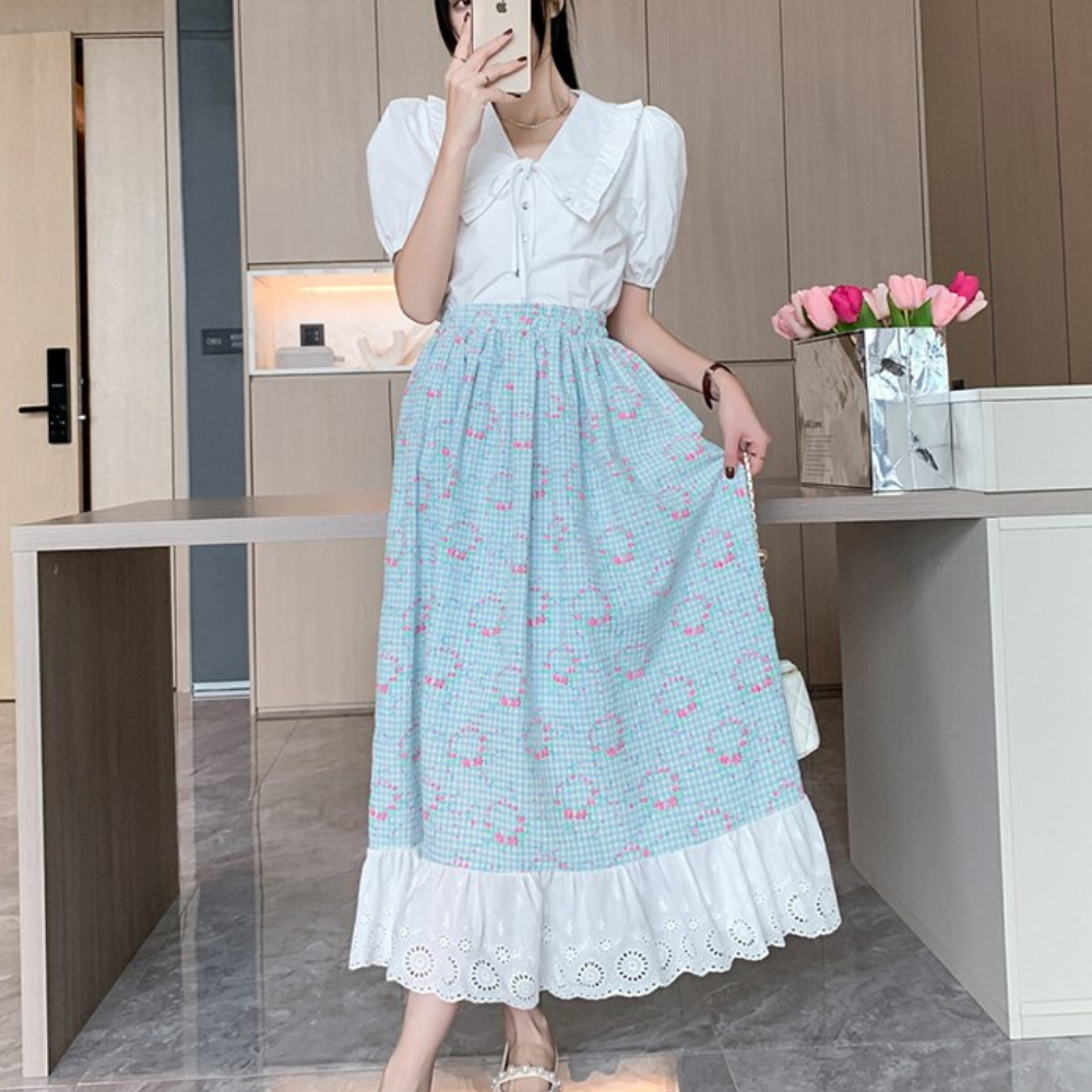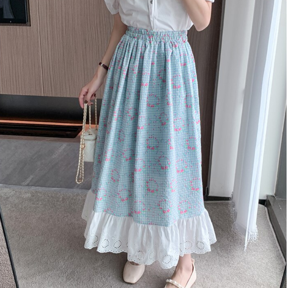 A skirt with a ruffle on the bottom with unique floral design.