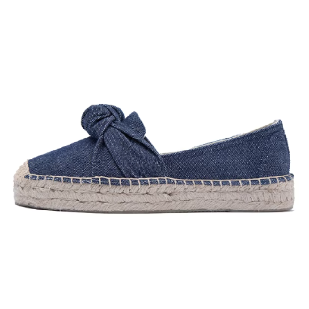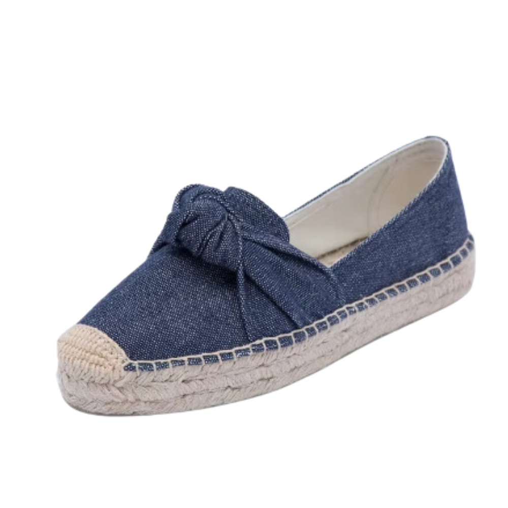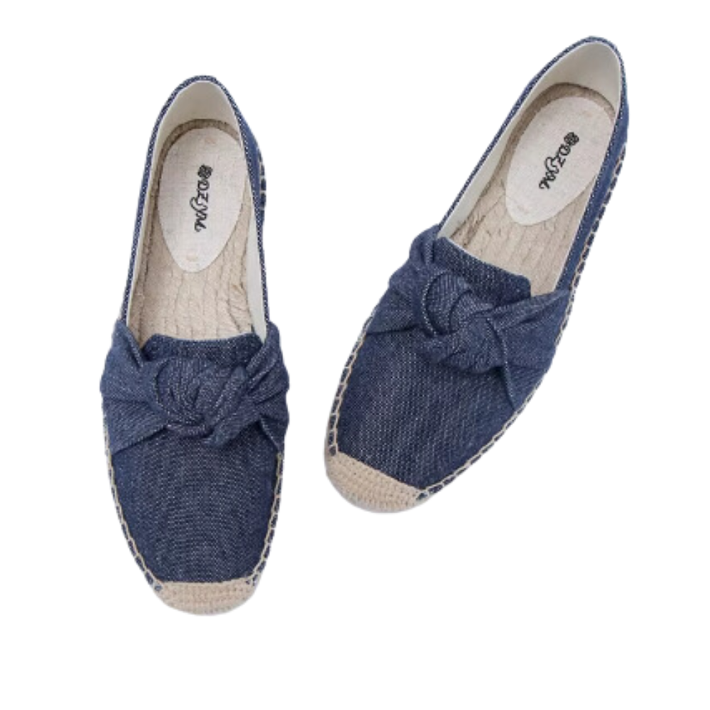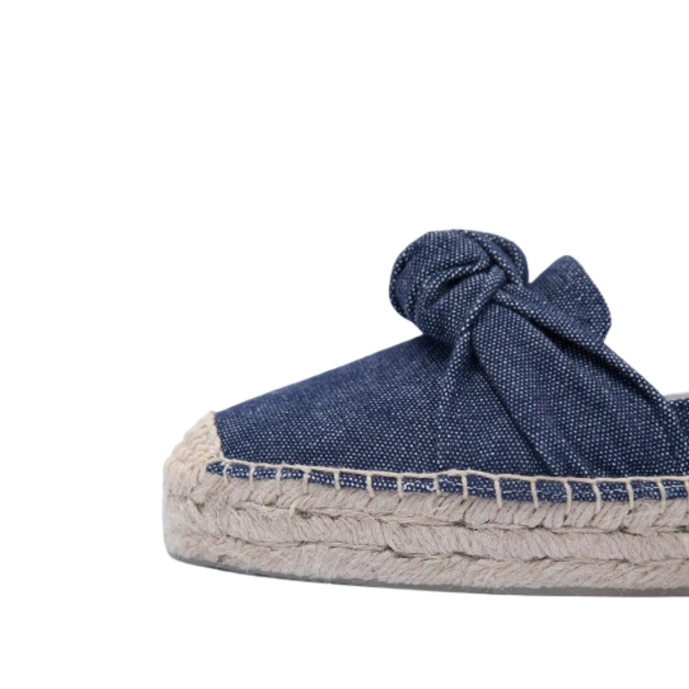 These are charming espadrilles crafted from a rich, deep blue denim. The fabric is subtly textured, adding a touch of casual sophistication. A large, hand-tied bow adorns the top of each shoe, adding a whimsical touch. The natural jute sole provides a grounding element, while the white insole offers a clean and crisp contrast. These shoes exude a relaxed yet stylish charm, perfect for a day filled with effortless grace.