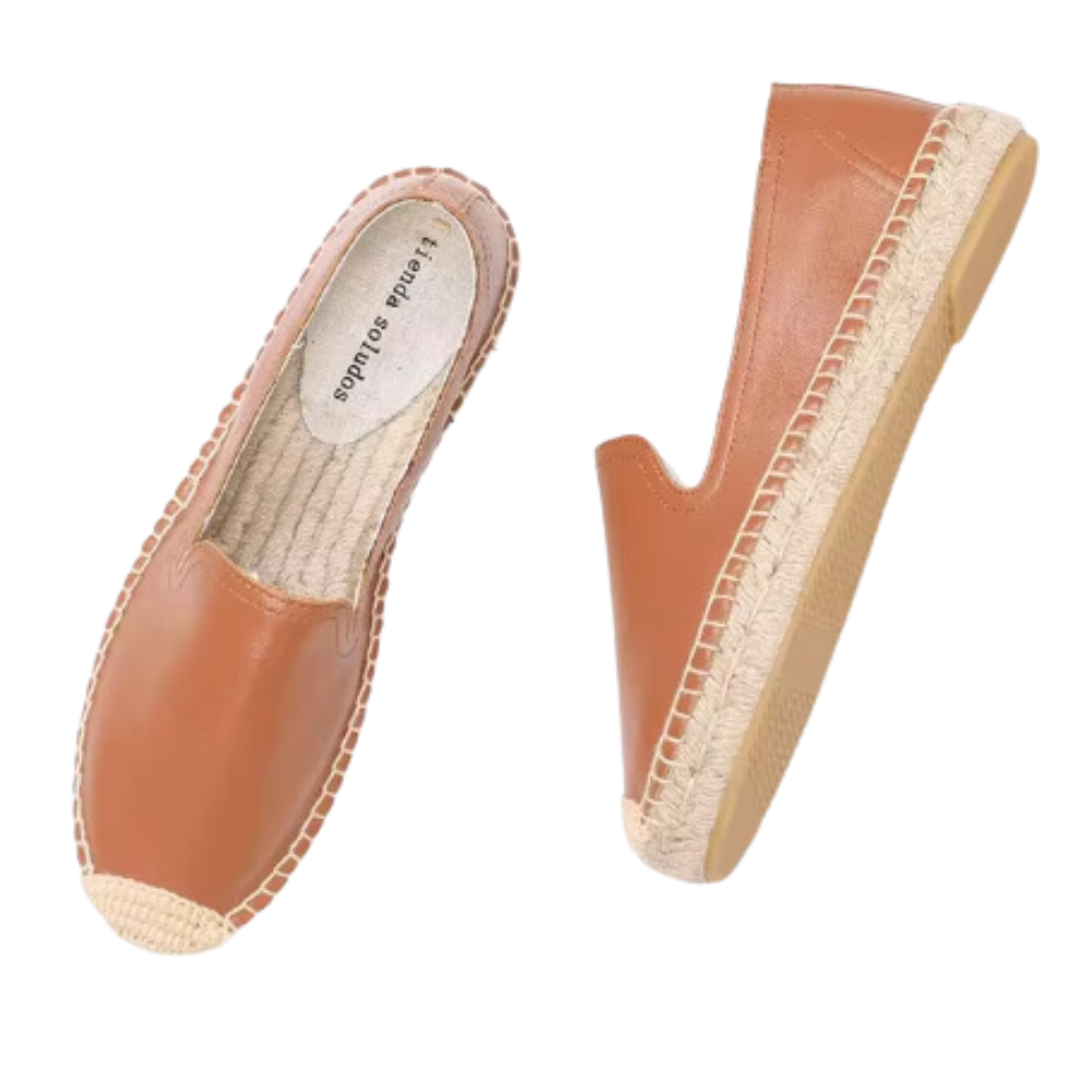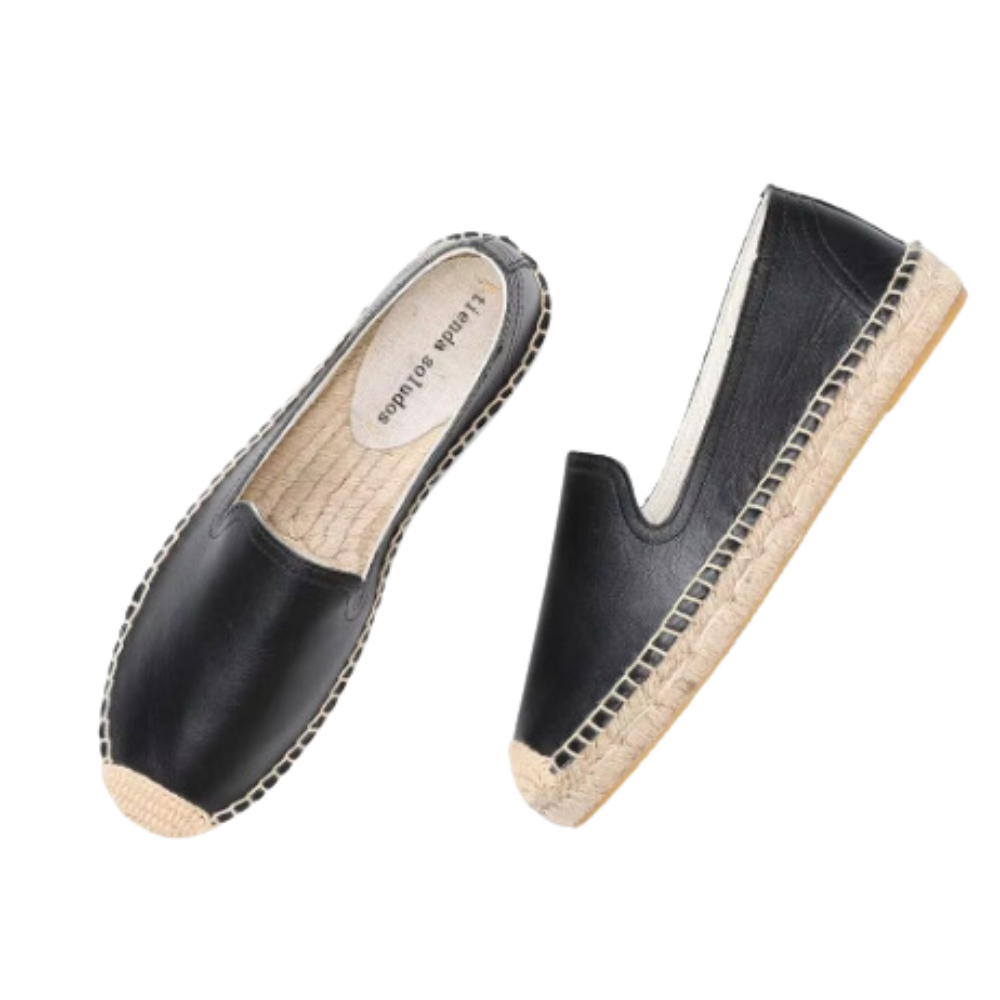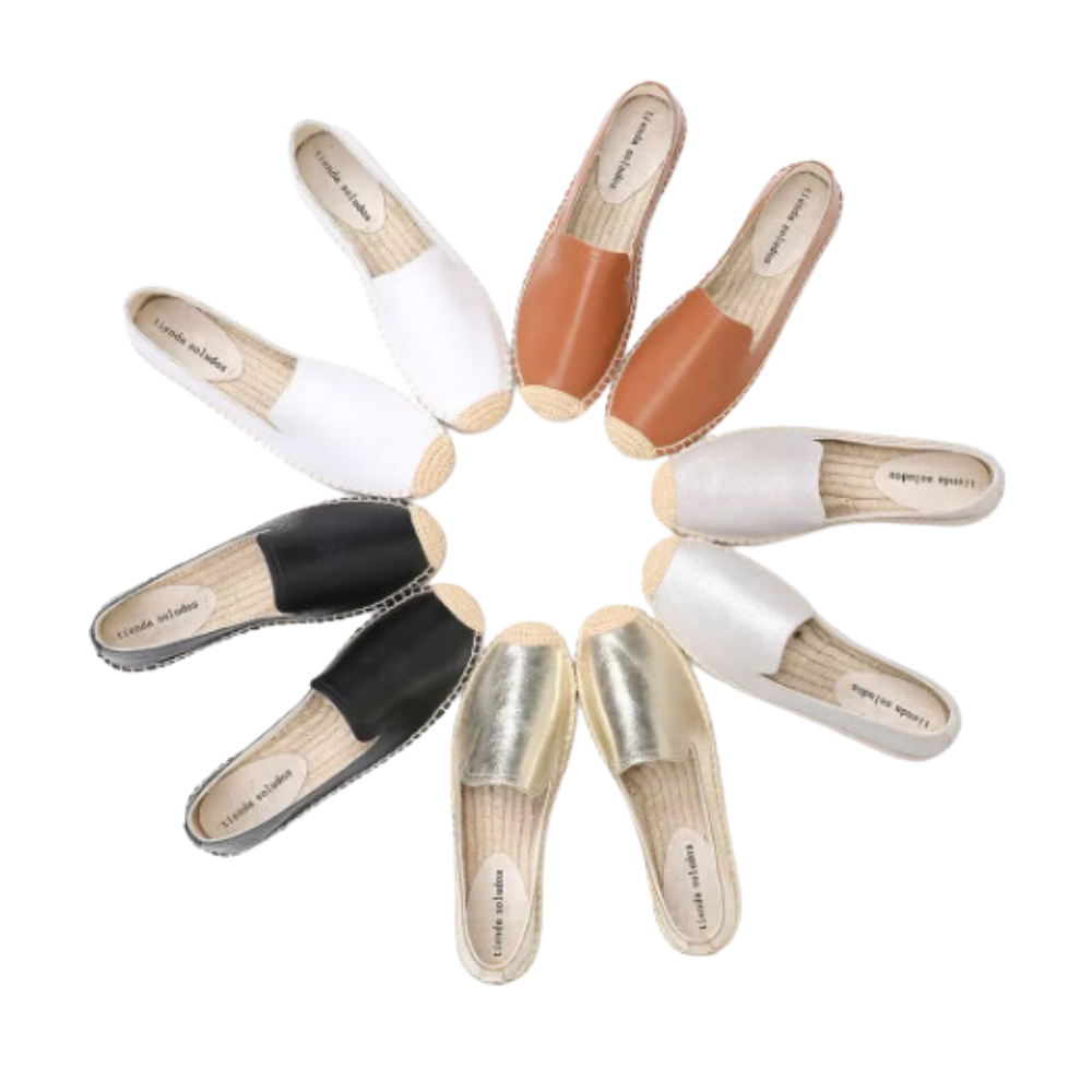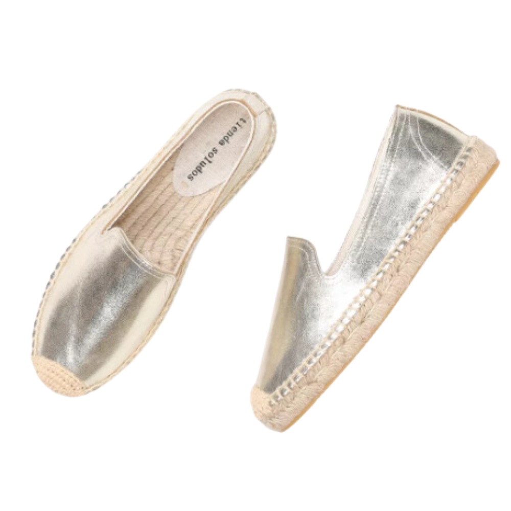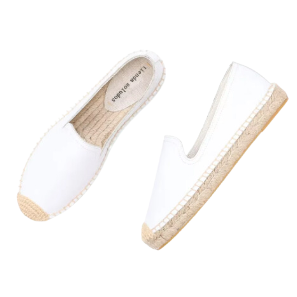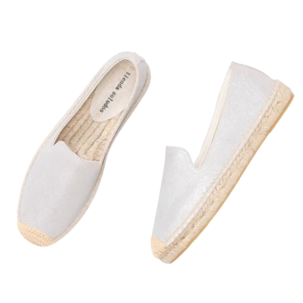 The shoes in the image are classic espadrilles with a simple and elegant design. They feature a plain color canvas upper and a natural jute rope sole.The sole has a rubber bottom for better grip and traction.
