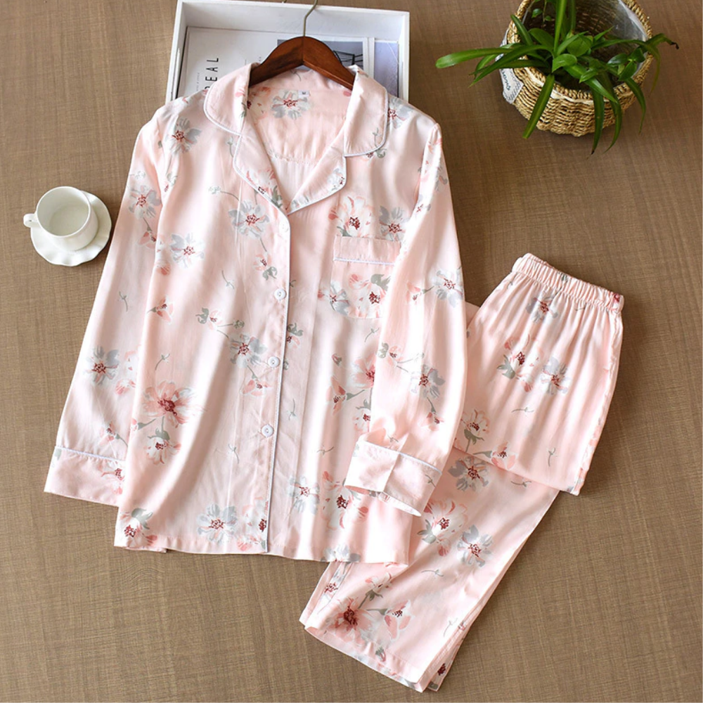The Tinia pajamas are some of the comfiest you'll ever wear - and they look cute, too. Made from stretchy modal that's light and breathable. The top fastens with glossy buttons, while the pants have an elasticated waistband.
